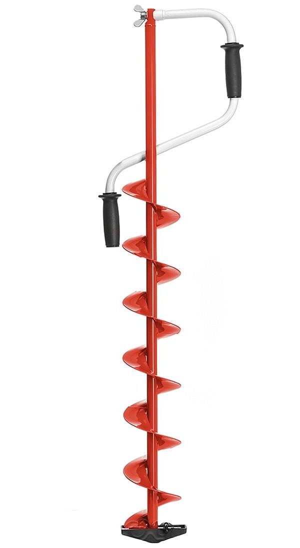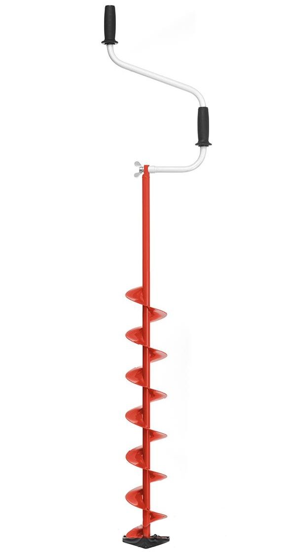 Верхняя рукоятка ледобура смещена относительно оси ледобура на 105 мм, а нижняя на 165 мм. Такое расположение рукояток позволяет вращать ледобур одновременно двумя руками, тем самым увеличивая скорость бурения лунок во льду.