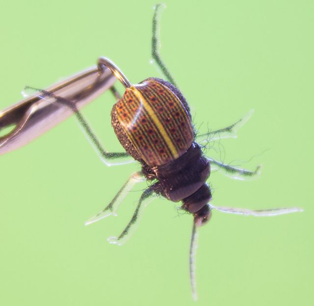 Приманка достоверно передает окраску насекомого, живущего в земле, но часто смываемого в воду при подъеме воды. Мушкой сибирского типа исторически не является, разработана с применением современных технологий. Обладает положительной плавучестью.