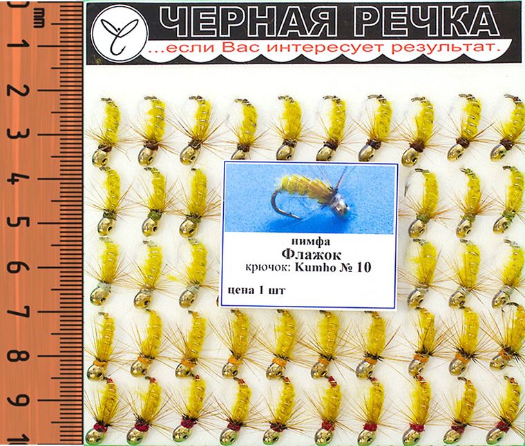 Нимфа "Флажок" показывает хорошую уловистость в любое время года. Для создания сегментации и повышения прочности используется латунная проволока с золотым покрытием, которая хорошо видна при намокании приманки.