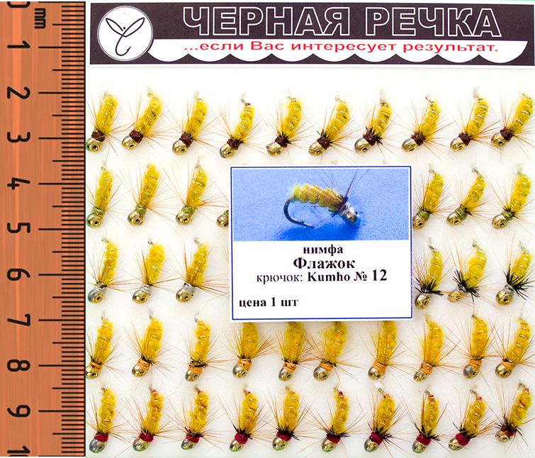 Нимфа "Флажок" показывает хорошую уловистость в любое время года. Для создания сегментации и повышения прочности используется латунная проволока с золотым покрытием, которая хорошо видна при намокании приманки.