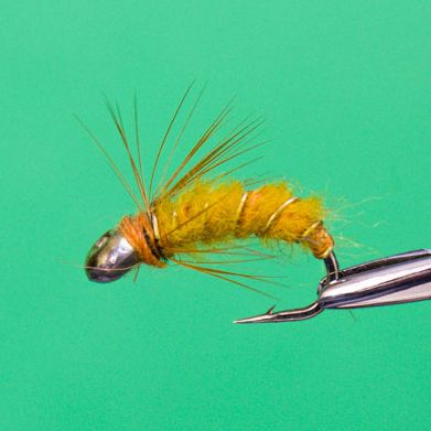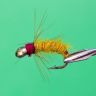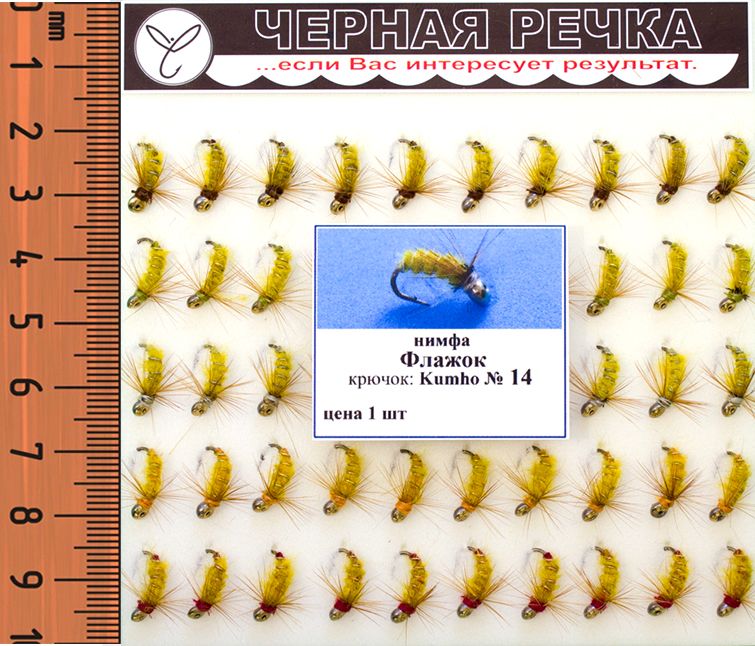 Нимфа "Флажок" показывает хорошую уловистость в любое время года. Для создания сегментации и повышения прочности используется латунная проволока с золотым покрытием, которая хорошо видна при намокании приманки.