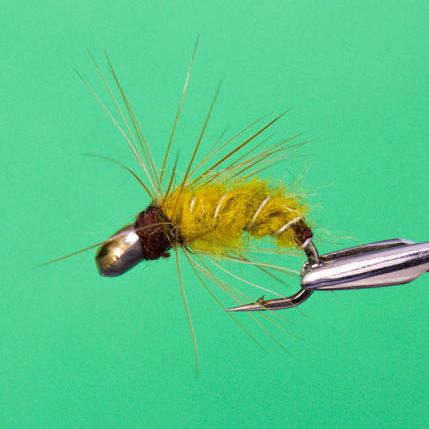 Нимфа "Флажок" показывает хорошую уловистость в любое время года. Для создания сегментации и повышения прочности используется латунная проволока с золотым покрытием, которая хорошо видна при намокании приманки.