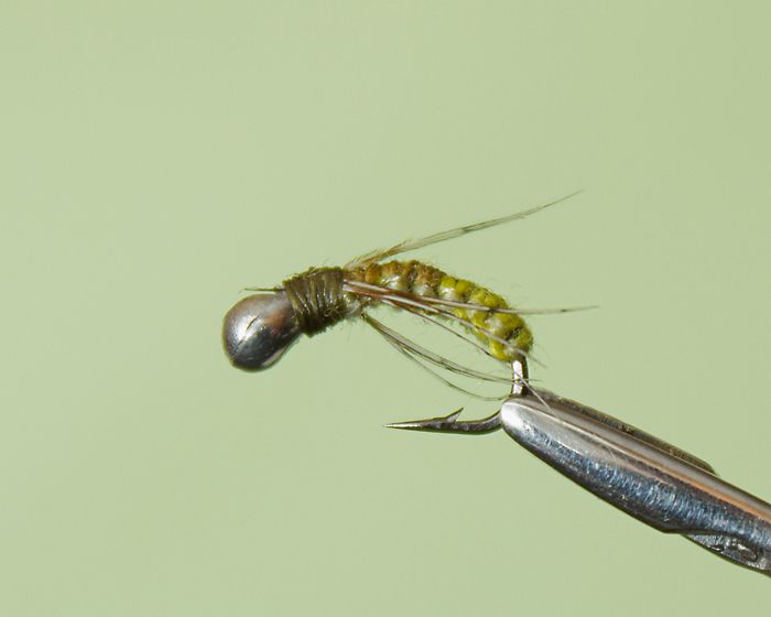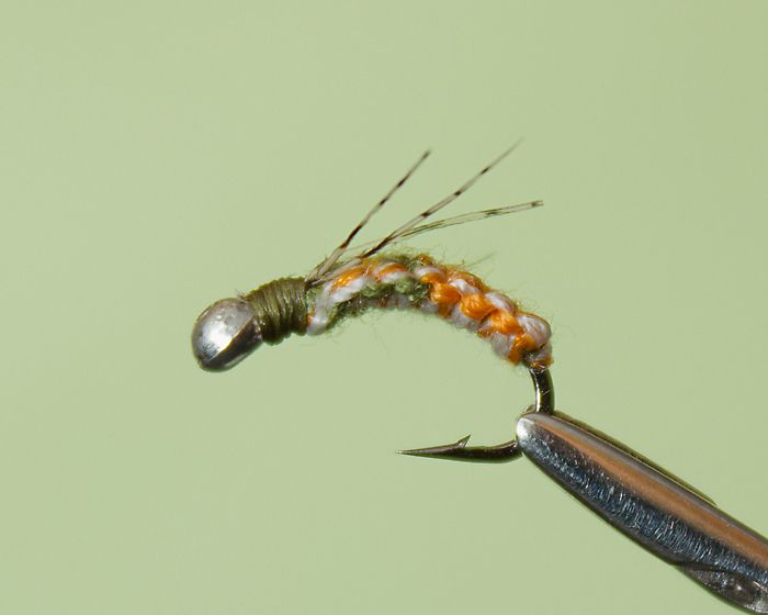 Нимфы, исполненные приемом плетения пучками волокнистых нитей, заслуженно пользуются вниманием сибирских рыболовов, прежде всего за счет оригинальной раскраски. Спинка и брюшко имеют разные оттенки, а узелки по бокам создают плоское тело и контрастно оттеняют оба цвета. При разработке нимфы плетеная Трехцветная «Черная речка» пошла еще дальше, добавив в окраску спинки третий оттенок, равно контрастный по отношению к двум основным. Привлекательность приманки усиливают подвижные элементы — ножки из тонкой и пестрой ости пера куропатки. Цветовой подбор ориентирован на мелких донных насекомых, прежде всего личинок поденок и веснянок.
