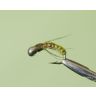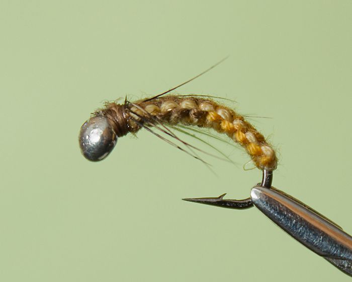 Нимфы, исполненные приемом плетения пучками волокнистых нитей, заслуженно пользуются вниманием сибирских рыболовов, прежде всего за счет оригинальной раскраски. Спинка и брюшко имеют разные оттенки, а узелки по бокам создают плоское тело и контрастно оттеняют оба цвета. При разработке нимфы плетеная Трехцветная «Черная речка» пошла еще дальше, добавив в окраску спинки третий оттенок, равно контрастный по отношению к двум основным. Привлекательность приманки усиливают подвижные элементы — ножки из тонкой и пестрой ости пера куропатки. Цветовой подбор ориентирован на мелких донных насекомых, прежде всего личинок поденок и веснянок.