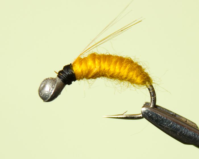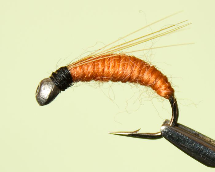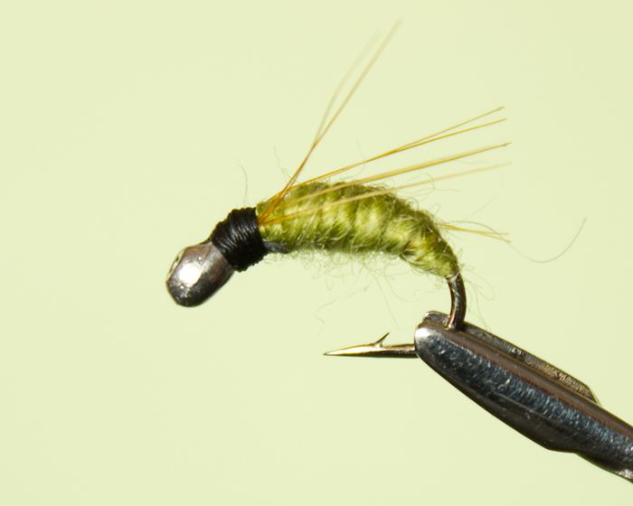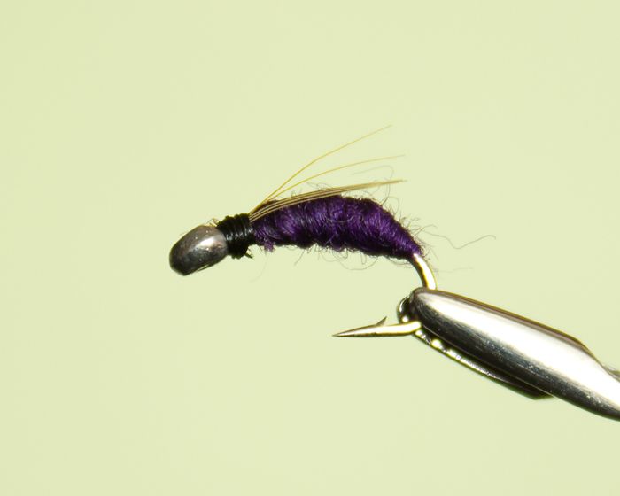 Тело нимфы покрыто витками шерстяной нити, создающими одновременно тонкую сегментацию и ворсистость. Черная шейка контрастирует как с блестящей оловянной головкой, так и с цветным телом, а ость пера петуха служит мягкому размыванию силуэта мушки. Цветовая палитра традиционна, состоит из наиболее востребованных в разные сезоны и в разных условиях ловли расцветок.