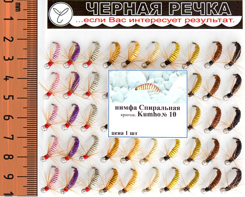 Сегментация нимфы "Спиральная" исполняется скруткой из цветной шерстяной нити с последующей промоткой между витками нитью другого цвета. Варианты расцветок подобраны многолетней практикой на водоемах. Мушка обладает высокой выживаемостью. Особенно хорошо работает в период холодной воды.