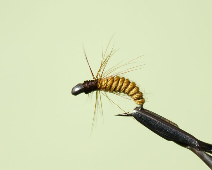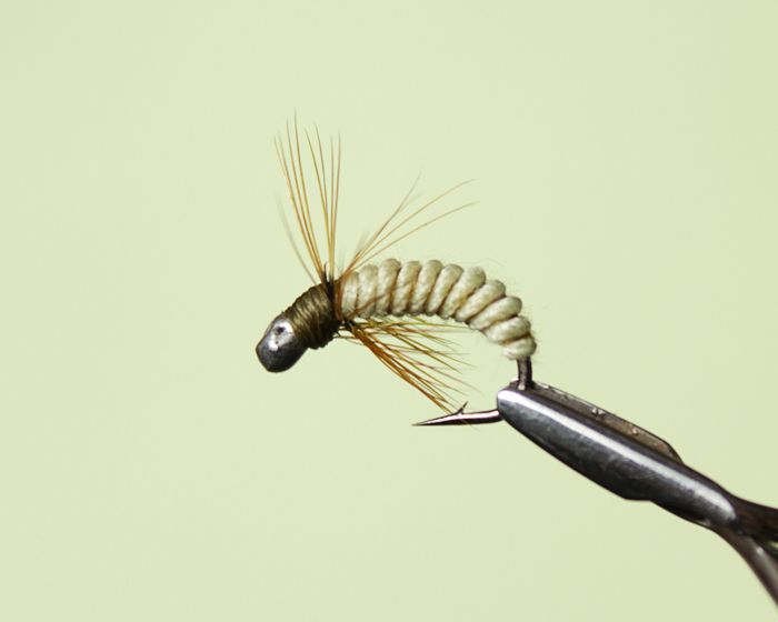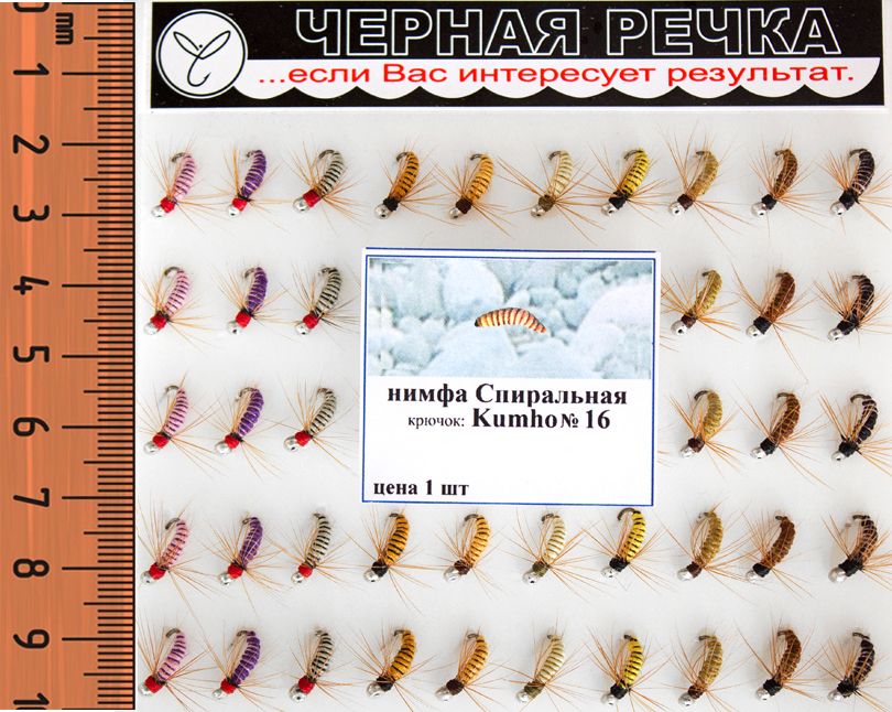 Сегментация нимфы "Спиральная" исполняется скруткой из цветной шерстяной нити с последующей промоткой между витками нитью другого цвета. Варианты расцветок подобраны многолетней практикой на водоемах. Мушка обладает высокой выживаемостью. Особенно хорошо работает в период холодной воды.